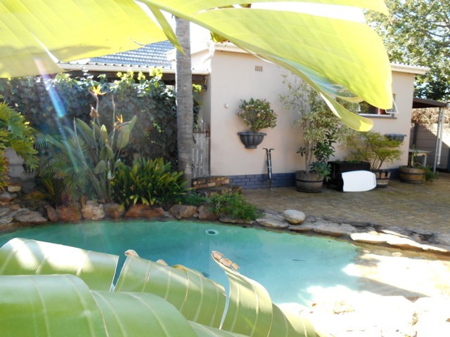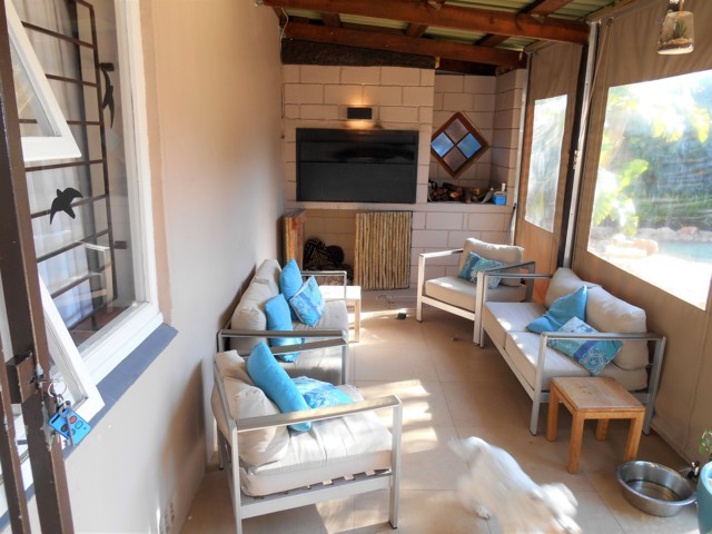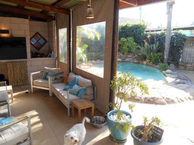 Under roof braai area with canvas paneling to keep the bad weather at bay during the winter months. Opens up to a free style pool – perfect for entertaining in the summer months.Â