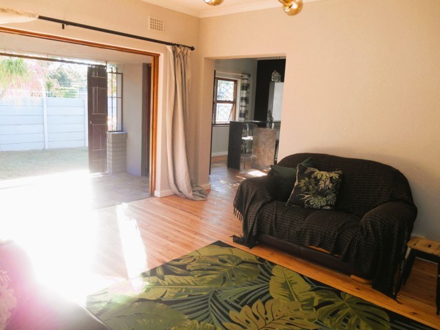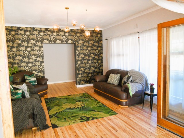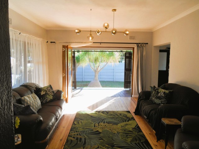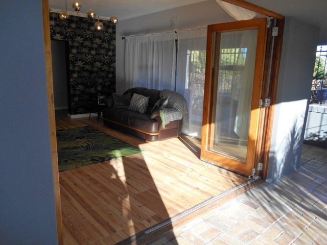 The spacious lounge has wooden stack doors that opens to the stoep and garden.