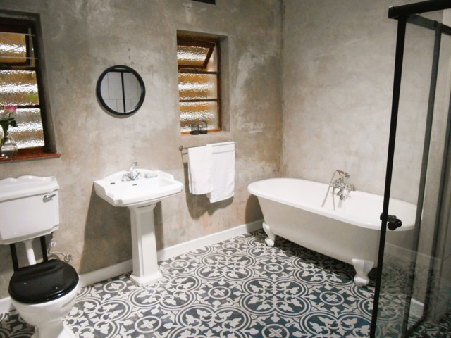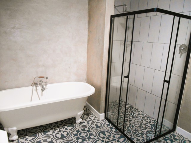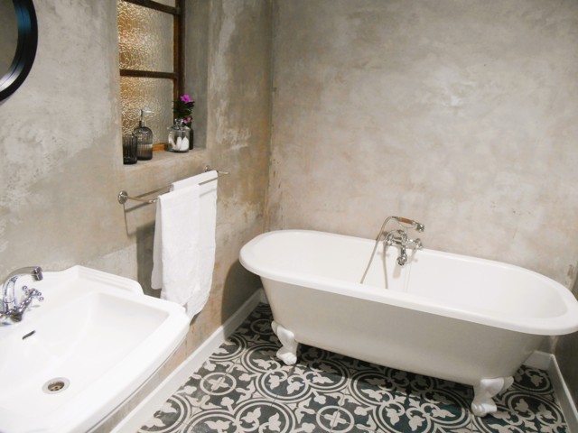 The huge family bathroom has a slipper bath, shower, basin and toilet.