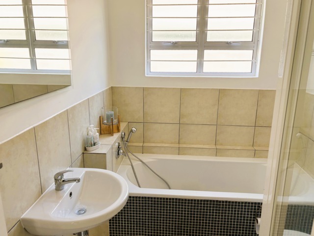 The family bathroom is well appointed with a bath, shower, basin, and toilet. There is a separate guest toilet with basin for extra convenience.