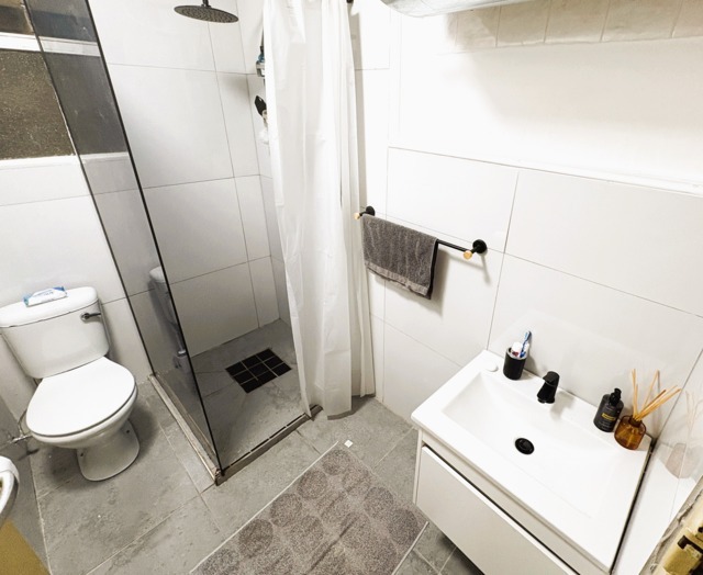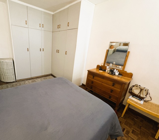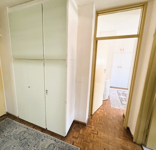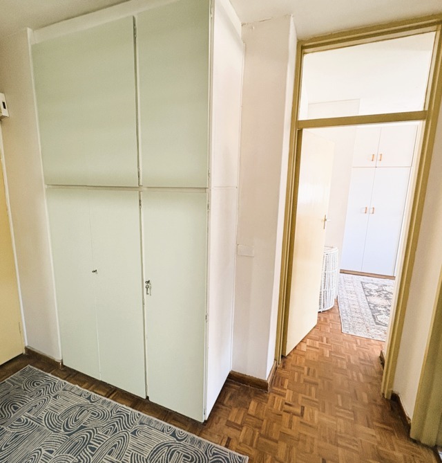Large bedroom with bic. There are extra storage cupboards in the entrance hall. The renovated bathroom has a shower, basin and toilet.